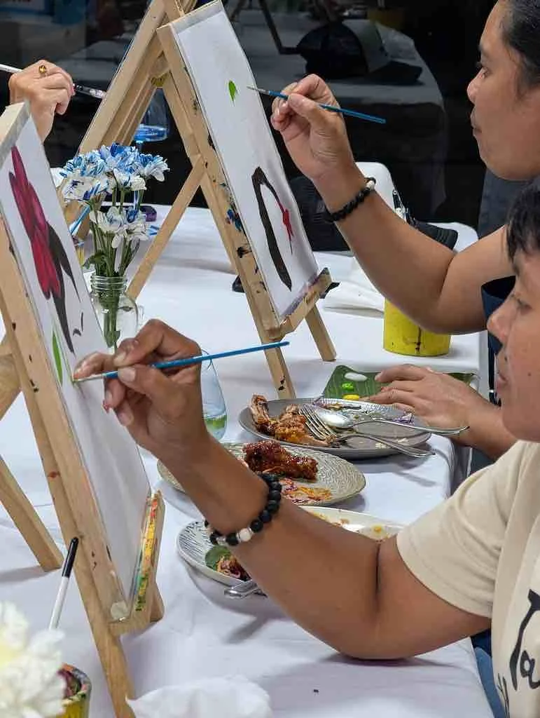 Our Art & Dine events feature rotating artistic themes. For example, some nights might offer a "Cultural Night" with Balinese portraits, while others could focus on flower vase painting or traditional Balinese flower art. Please check our schedule for the specific theme offered on your desired date.